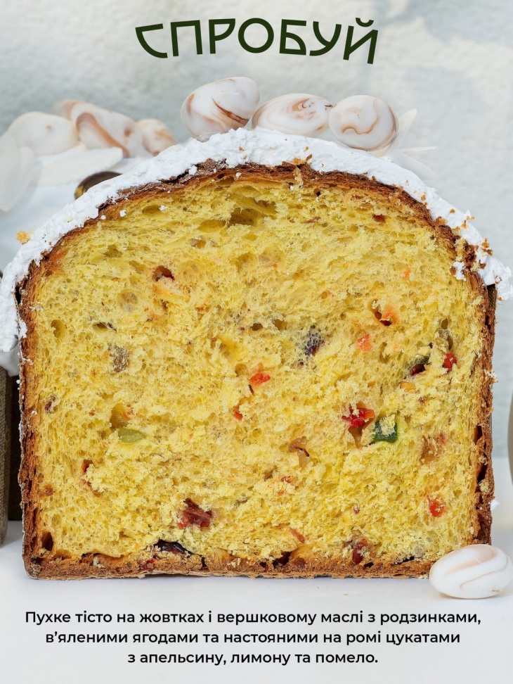 Пухке тісто на жовтках і вершковому маслі, з родзинками, в’яленими ягодами та цукатами, настояними на ромі.