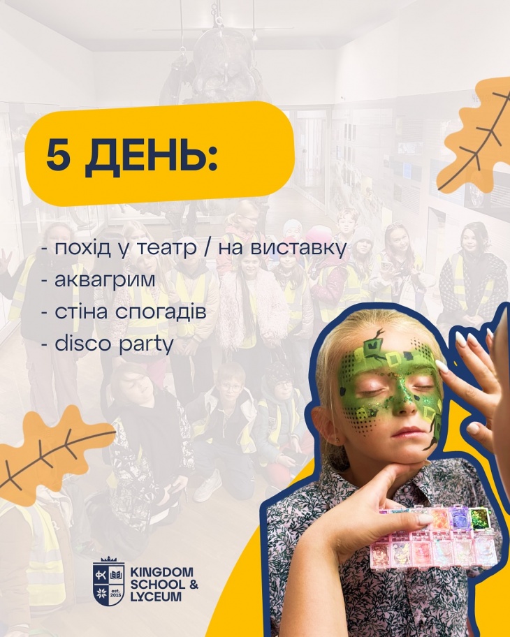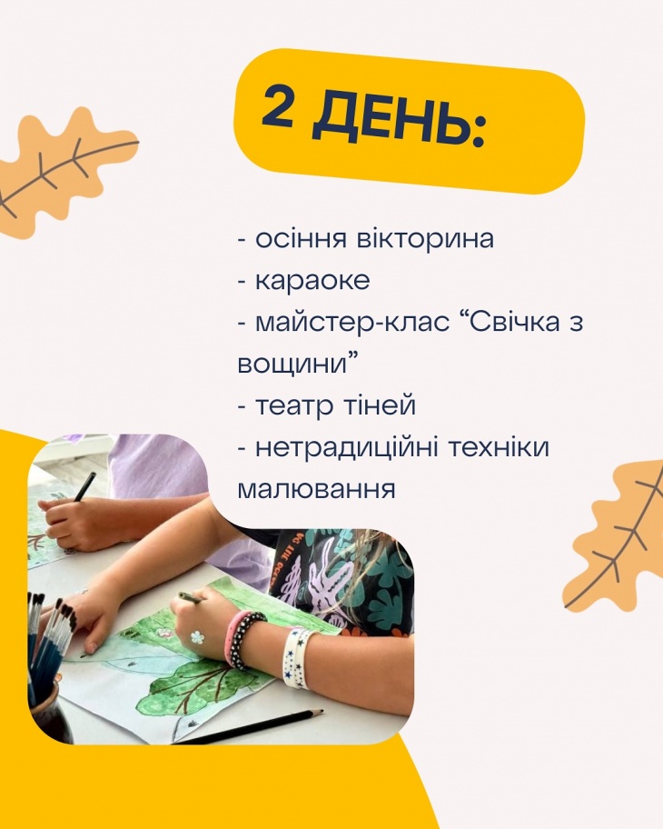 - Осіння вікторина, театр тіней, караоке, робимо свічку з вощини, вивчення нетрадиційних технік малювання.